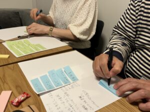 後半は、付箋を使ったグループワーク。まず各自が「福岡っぽいもの」を付箋に書き出し、評価する目盛を変えて並べ替えていく。並びを変えるごとに、グループ内で見せ合う。質問したり、好きなことや自慢のものを力説したりのやり取りで、情報を多方面から見ることになる。出し合った情報を二つに絞り、それにコーヒーを掛け合わせて、新商品やイベントを企画するというのが最終的なお題だ。