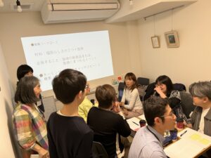 最初のワークは、会場であるカフェにあやかって、喫茶店メニューに喩えた自己紹介。一瞬途方にくれた表情が見えたが、シンキングタイムを経ると「王道ではないココア」、「コミュニケーションのあいだにあるコーヒー」、「店の看板」など、自身をひと言で表す見立てが出てきた。「昆布っぽいと言われるけれど喫茶店にはないですね」という参加者には、「和風カフェのお汁粉についている塩昆布がありますよ」とフォローの声がかかった。見立てが表すその人らしさに共通点や違いを感じ、初対面どうしが打ち解けていく。