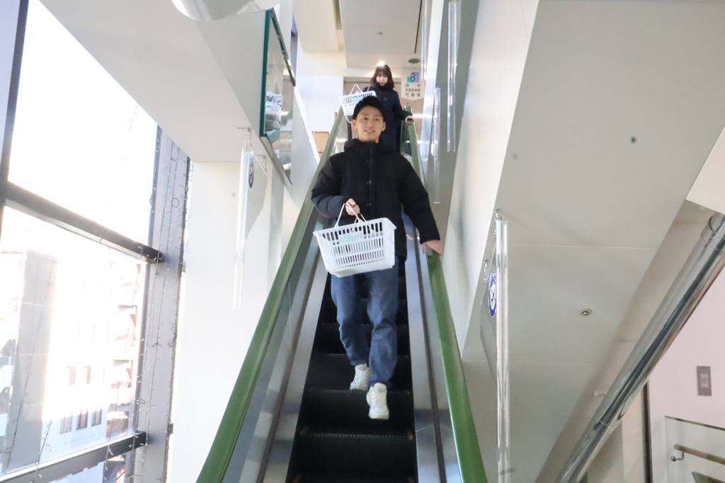 はじめに、ほんのれん編集部のウメコさんがこれからやることのルールを説明してくれました。買い物カゴを持ち、2グループに分かれていくつかのフロアを回りながら本を選んでいくとのこと。「気になった本をとにかくカゴに入れてみる」「買わない本でもカゴに入れてOK」「各フロアで1冊は選ぶ」。ふむふむ、とルールをあたまに入れたところでエレベーターに乗り込み、一気に最上階まで上がります。