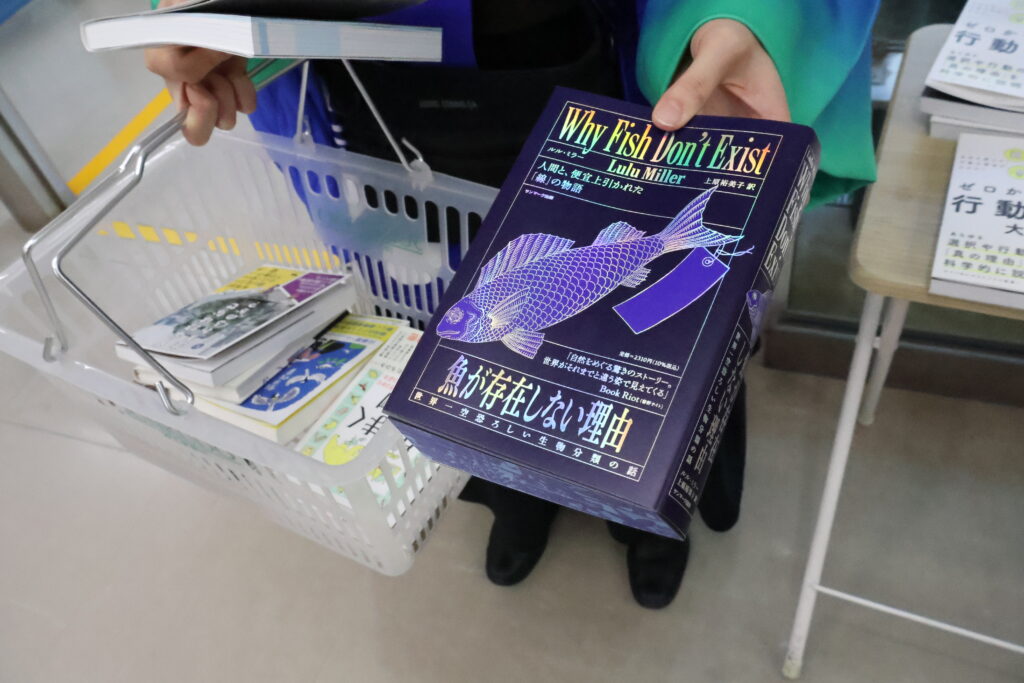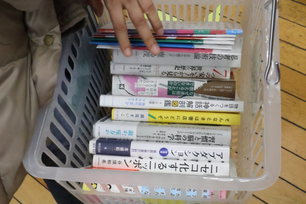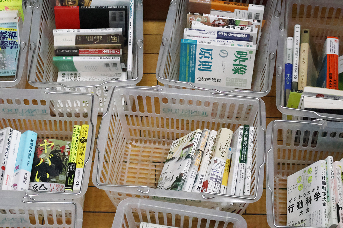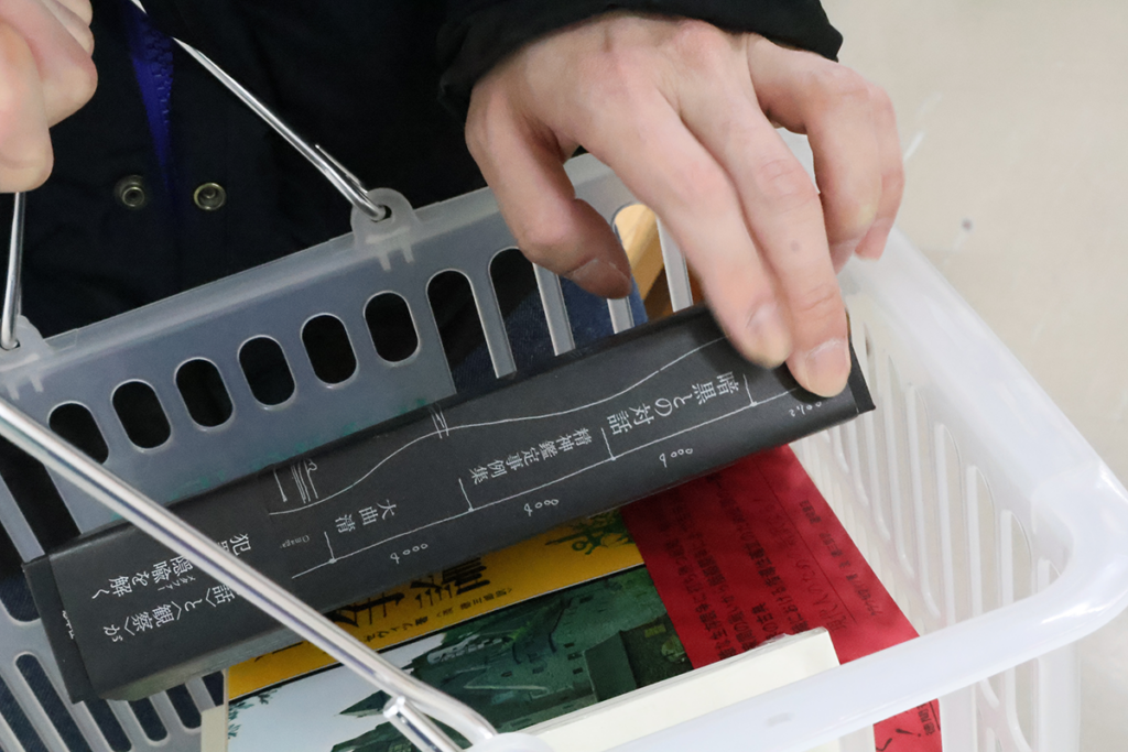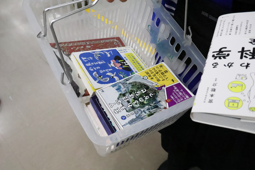 人によって食指が動く本はさまざまですね。カゴへの本の入れ方も、縦に積んでいくか横に並べるかという違いがあって面白い。最後に、こうして自分が集めてきた本たちに関連しそうな「旬感ノート」をひとつ選んでみるというミッションが告げられました。