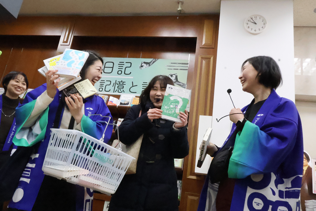 朝9時、イベントがスタート!いつもpodcast「ほんのれんラジオ」でゆるくて深いトークを繰り広げ、リスナーの好奇心をくすぐりまくっているほんのれん編集部の女子たちも揃いの法被で登場しました。まだ誰もいない書店なのに、ここだけ人だかりができていて特別感たっぷり。「ほんのれんラジオ」のファンだという方、知人に誘われた方、イシス編集学校で情報を得た方、たまたま書店のPOPでイベントのことを知った方など、さまざまな動機で都内はもとより遠方から駆けつけたという参加者も。