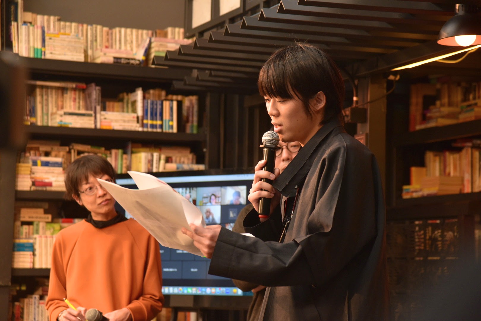 教室名フライヤー発表のコーナーが終わった後、穂積デザイナーを直撃してフォントについての考えを訊いた。穂積が編集工学研究所林頭の吉村とともに千夜千冊を追いかけて愉快なトークを繰り広げるショートラジオ「おっかけ!千夜千冊ファンクラブ」通称オツ千で、校長にはじめて褒められたデザインは文字だと話していたことがある。千夜千冊のトップ画像や感門之盟のタブロイド紙など穂積が手がけたデザインを見ると、異なる種類のフォントがさまざまに組み合わされているがどんな意図があるのか。