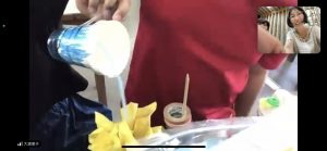 「コップのじょうろでお花に水をやっているところ」。石垣島の美術室とズームをつないで編集会議