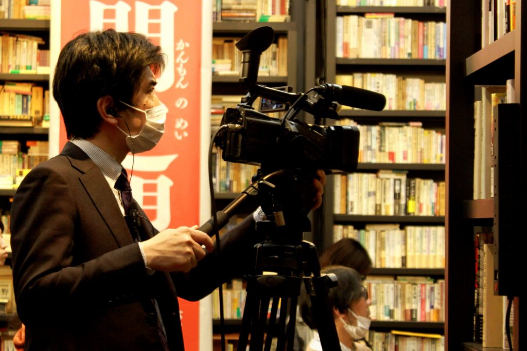 ▲黒膜衆の蒔田俊介は仕事帰りに本楼に直行。スーツ姿でカメラを構えた