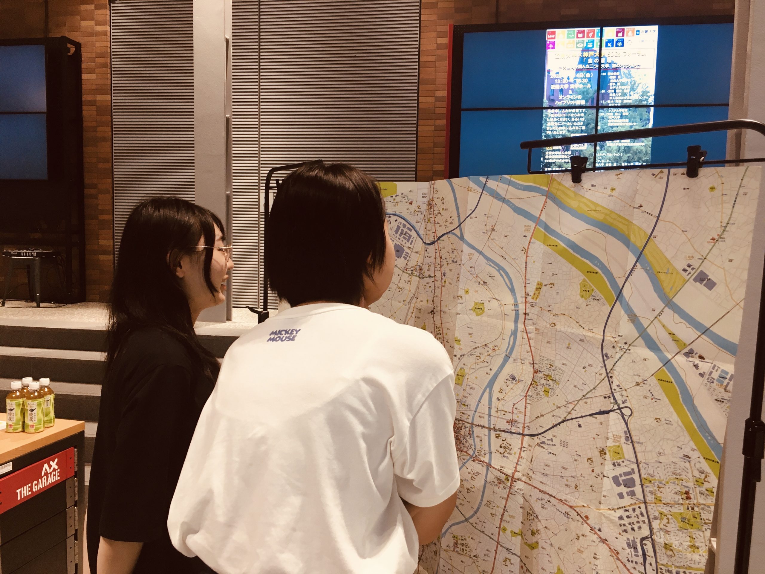 自己紹介のスライドは、ほかにも数種類。ダイヤグラム風に仕立てた自己紹介スライドが投影されると最前列の院生が「あの図ほしい」と目を輝かせ、中央に陣取る1回生がスマホで撮影。参加動機を聞けば「純粋に地図が好きだから」とか「小説の創作に活かせそうだから」と知的好奇心旺盛。参加者の所属学部は、文芸学部から総合社会学部 環境・まちづくり専攻、理工学部、農学部まで多種多様だ。