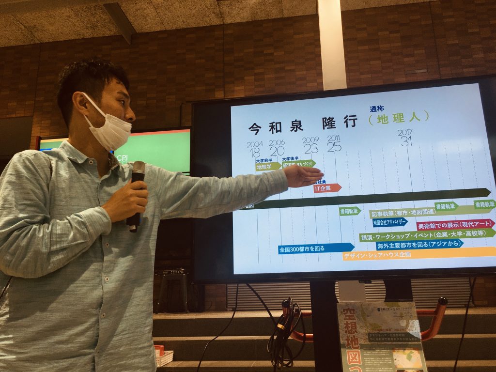 ワークショップは、路線図による自己紹介から始まった。自身の経歴を路線図に見立てて、一枚図にまとめたスライドが投影される。近大生がざわめいた。地理人いわく、ウケを狙ったわけでも、見栄えの良さを目指したわけでもなく、自分の思考を表現するためには「図」が最適だから自然と路線図モードにまとまったという。「ネイティブ言語が、記号なんです」。こともなげに語る。根っからの図解派なのだ。