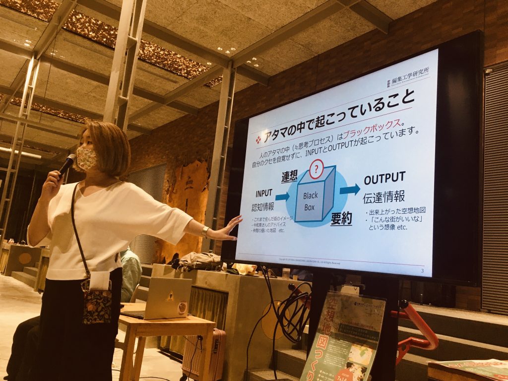 ▲地図づくりが終わると、衣笠がここまでのワークを編集工学的に解説してみせた。