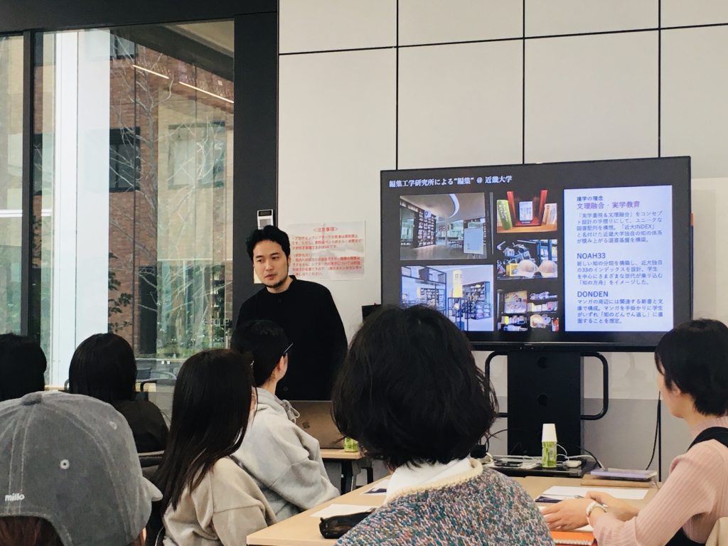 なぜ、靴下づくりと編集稽古が結びつくのか? 誰もが気になる謎をそっとちらつかせながら、編工研執行役員の橋本英人がレクチャーを進める。松岡正剛が監修をしたアカデミックシアターの一室で、近大生は《編集思考素》という情報編集の型を学んでいく。