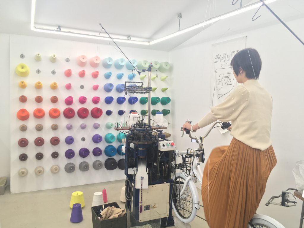 「チャリックス」とは、自転車をこぐ力で、靴下の編み機を動かす独自のシステム。そう、名前も実態も、自転車(チャリ)+靴下(ソックス)の《一種合成》で出来ている唯一無二の靴下マシンなのだ。一種合成の可能性を肌で感じられるこのマシンに、編工研の橋本と衣笠が注目して、今回のリアル編集力講座が実現した。