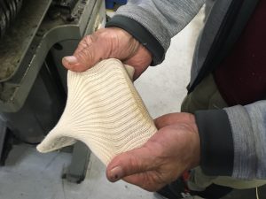 自転車のチェーンは、そのまま編み機につながっている。ひと漕ぎするたびに、編み機がガチャンガチャンと音を立てて高速で回転。靴下を編み上げていく。案内してくださった会長さんによれば、このマシンは80年代90年代に、女子高生の足元を飾ったルーズソックスを作っていた機械だとか。ルーズソックスは、一般的な靴下に比べると編み目が粗い。粗い編み目をつくれるマシンだからこそ、人力でも短時間で靴下がつくれるという。