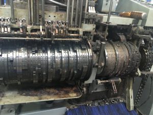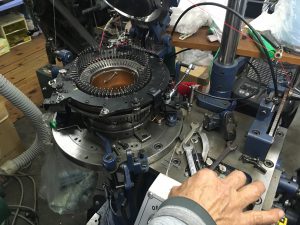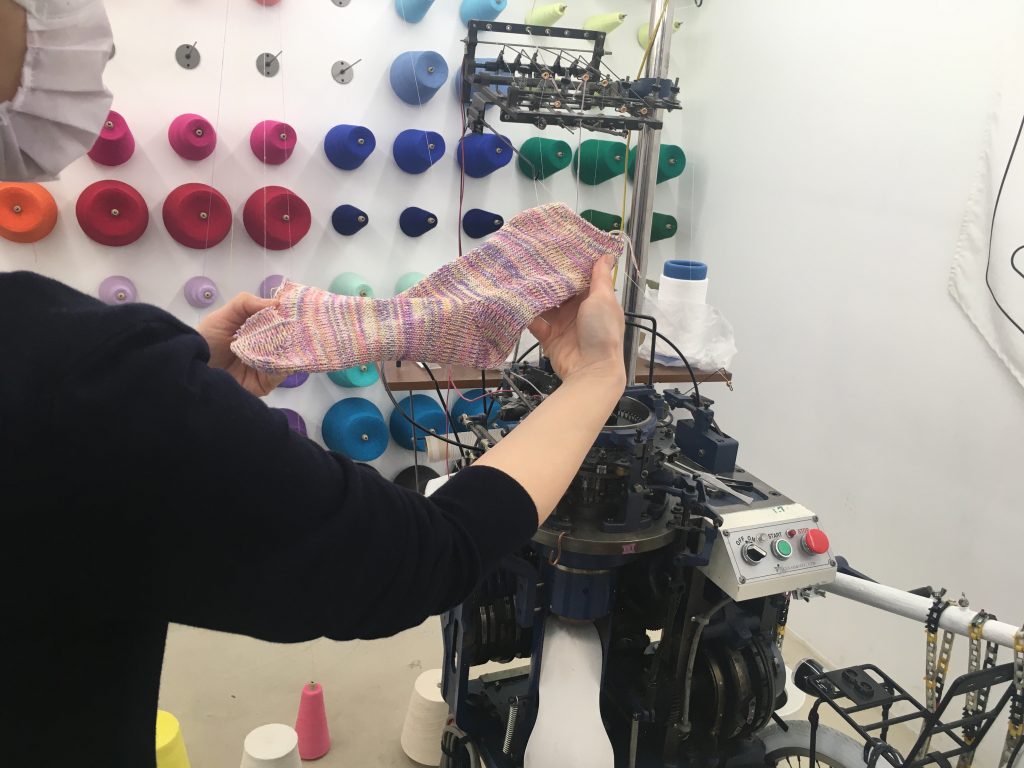 100年前から靴下をつくってきた株式会社 創喜さんにご協力をいただき、「チャリックス」というオリジナルの編み機をつかって、近大生は靴下をつくっていく。(株式会社 創喜 S.Labo https://slabo.souki-knit.jp/)