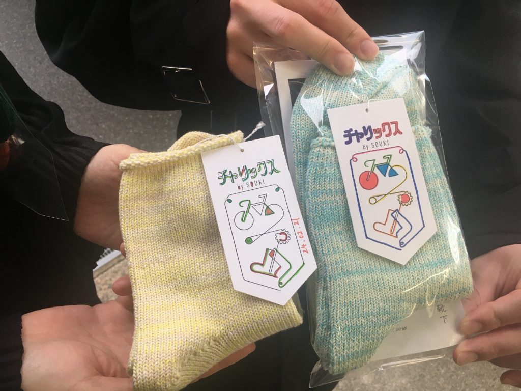 足に心地よい疲労がたまってきたころ、ストンと靴下が流れ出てきた。完成品がマシンから滑り落ちてくるシーンは、なぜか出産をおもわせるもの。見ていた学生たちが「生まれた!」と喜び、漕ぎ手に「おめでとう」と声をかけていた。