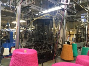 創喜さんのご厚意で、実際に稼働中の工場を見学させてもらった。轟音のなか、無数のマシンとカラフルな色糸が規則正しく動いている。驚くのは、現役のマシンもずいぶんアナログだということ。おびただしい数の歯車ががっちりと組み合い、高速で回転している。かなりデジタル化された編み機もあったが、はやく、高品質な靴下をつくるためには、アナログ機械のほうがまだまだ勝っているとか。
