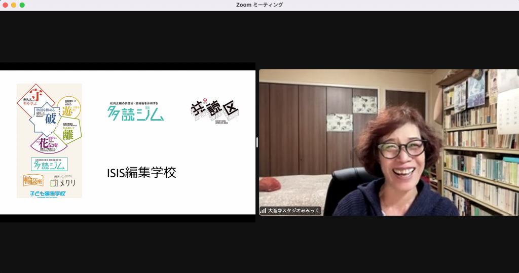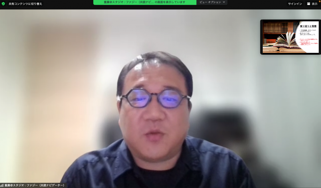 実は読めるのは1冊だけではない。他にも2冊の大筋が掴めて、23冊全部が摘み読みできる。自身の読書法に不安があった人には、直接やり方を習える貴重な場だ。積読解消なるかと思いきや、つい他の本もポチッとしたくなる、積読倍増要注意な場でもある。今回は、多読ジムのトレーナー役のひとり、重廣竜之冊師がナビゲーター役を、裏を取り仕切る大音美弥子冊匠がZoomホスト役をつとめた。
