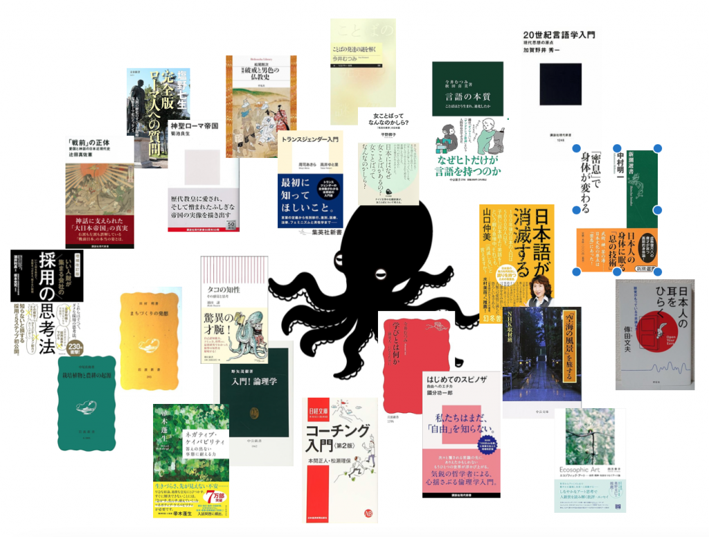 『タコの知性 その感覚と思考』を選んだ参加者は大音冊匠に「凄いの、選びましたね」と突っ込まれ、クネクネ応じる。冊匠は「カイヨワにも『蛸』がある」とすかさず尾鰭ならぬ足を付けた。スピノザを選んだ参加者には勇気を讃える声も上がった。他にもジャケ買い、タイトル買い、勧められたけれど積読なまま、今だからこそ、前から興味津々など、様々な理由で選ばれた個性豊かな本が並ぶ。一番人気は今井むつみ。言葉にちなんだ本、多読ジムで共読中の『性の境界』絡みの本、アフターコロナの教育や社会のあり方を問う本など、今の空気感が反映された本が勢揃いした。
