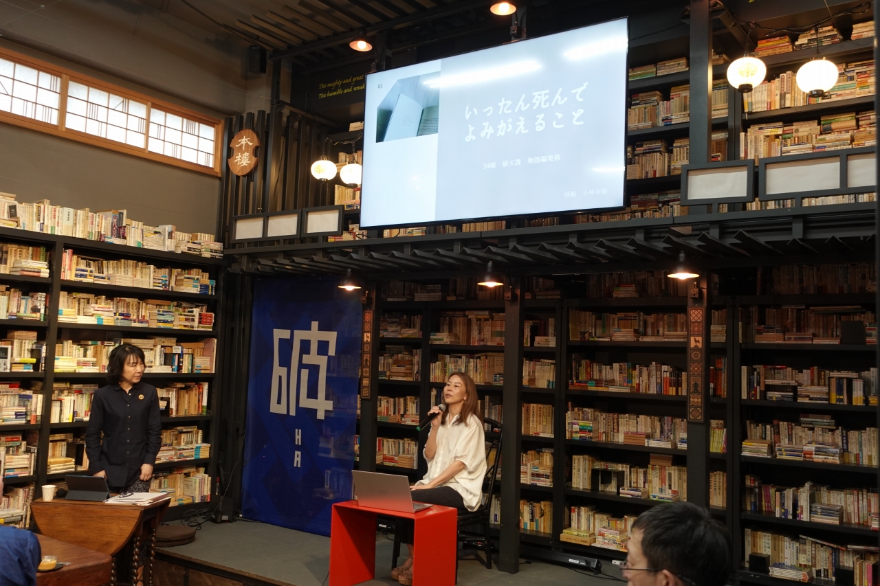 本棚を見て回るにあたって、気になる書物を写真で撮影し、昼食の際に紹介することにしました。学衆Oさんはエディットタウンの入口側へと戻り、松岡の紹介する映像を見ながら、心のなかで対話をしていたようです(アイキャッチ画像のことです)。