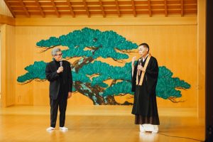 白足袋姿の松岡正剛が三井寺長吏の福家俊彦とともに、鏡板に描かれた老松を背に能舞台に立った。「仏教の会になぜ能なのか?」ワキの導きによって、中世において大きく花開いた両者と出会いなおす一日がはじまった。