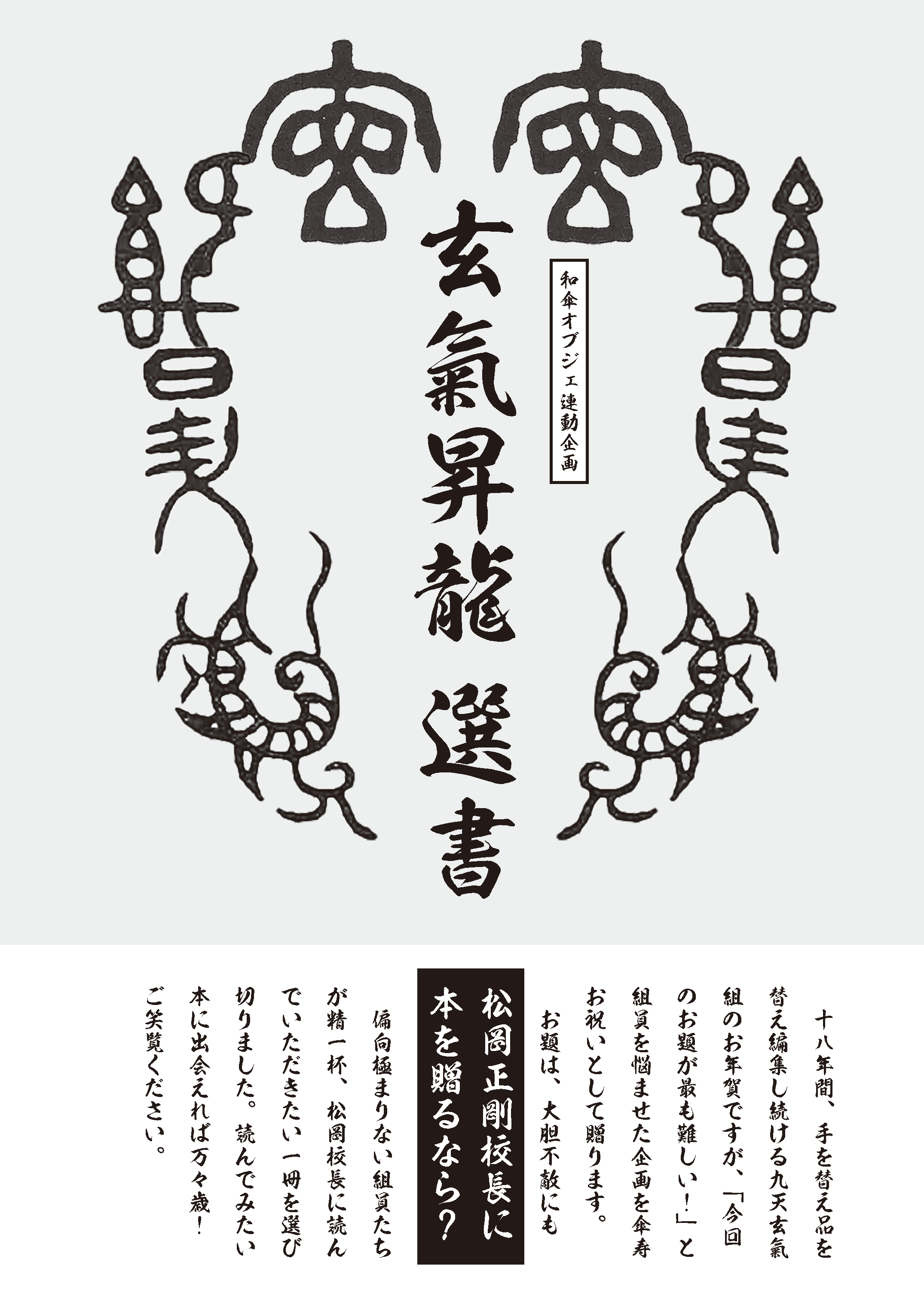 「大義名分は年始挨拶だけど、実態は校長松岡正剛への恋文? それとも直訴状!?」とほくそ笑みながら企画から制作まですべての指揮をとるのは、九州支所「九天玄氣組」組長の中野由紀昌である。九天の年賀作品は、発足した2006年から2024年までの18年間、毎年欠かさず松岡校長に贈り続けている。