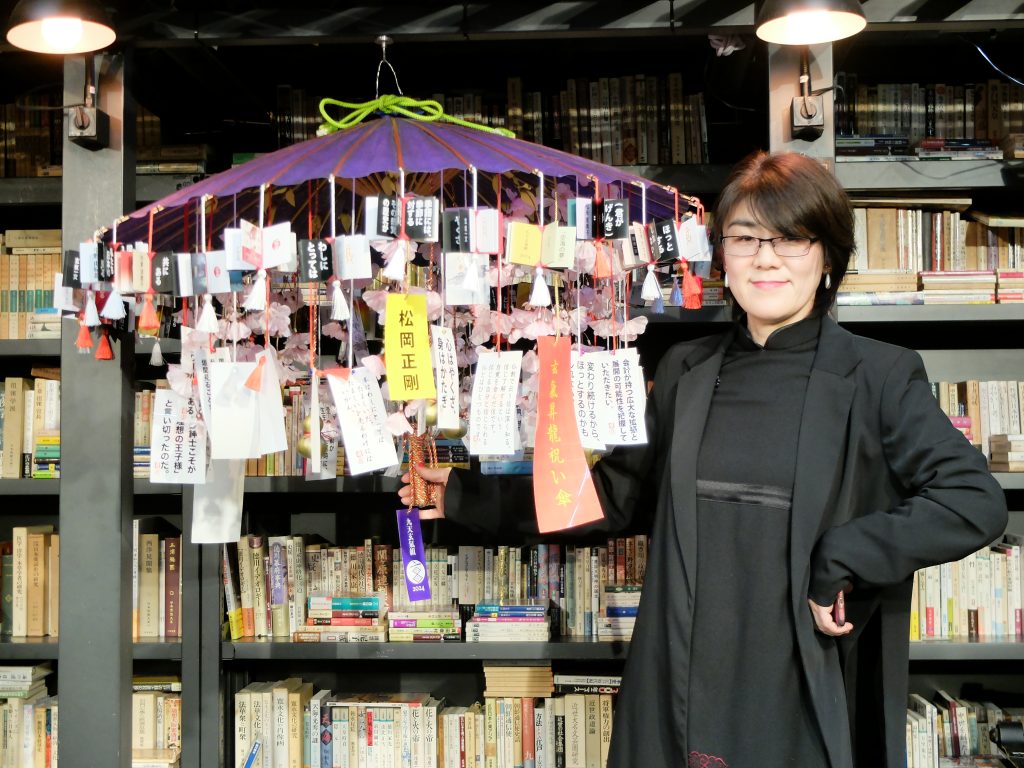 「玄氣昇龍祝い傘」にはクラウン・ブックと選書のフレーズを抜き出した短冊がセットでぶらさがる