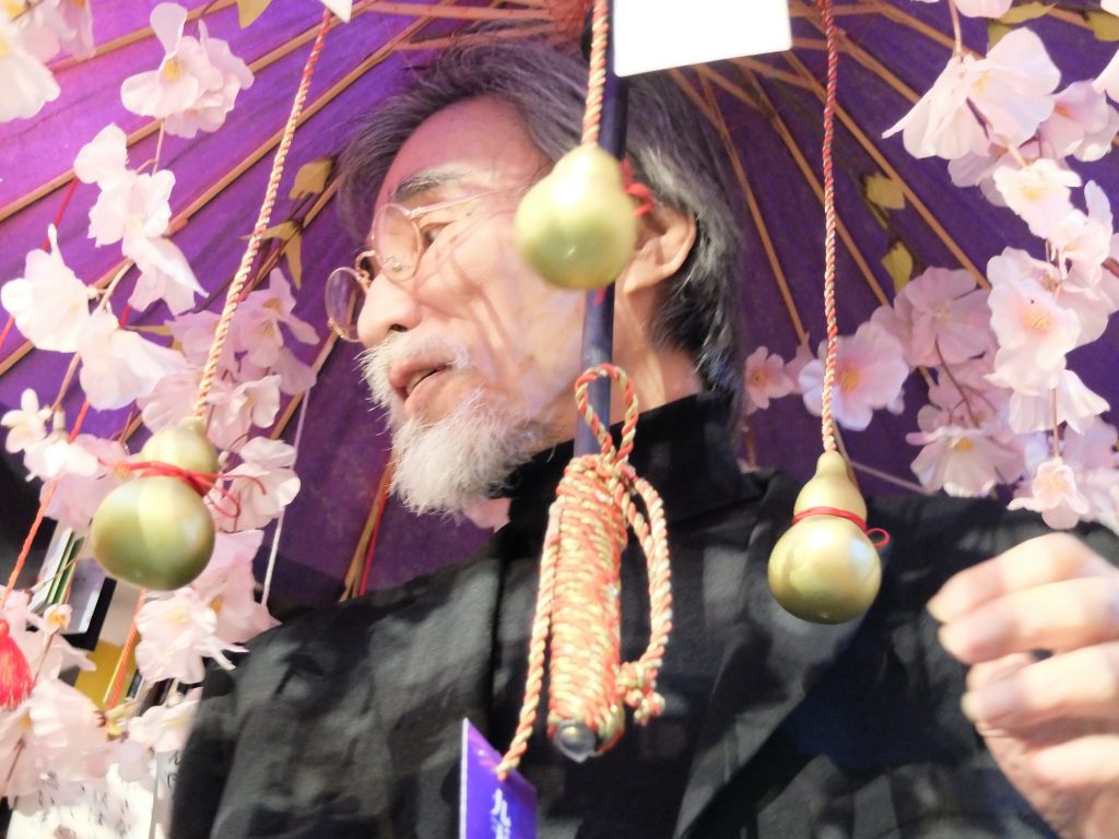 九天の手匠・内倉須磨子(北九州)制作の玄氣昇龍祝い傘にもぐりこみ、たわむれるセイゴオ校長