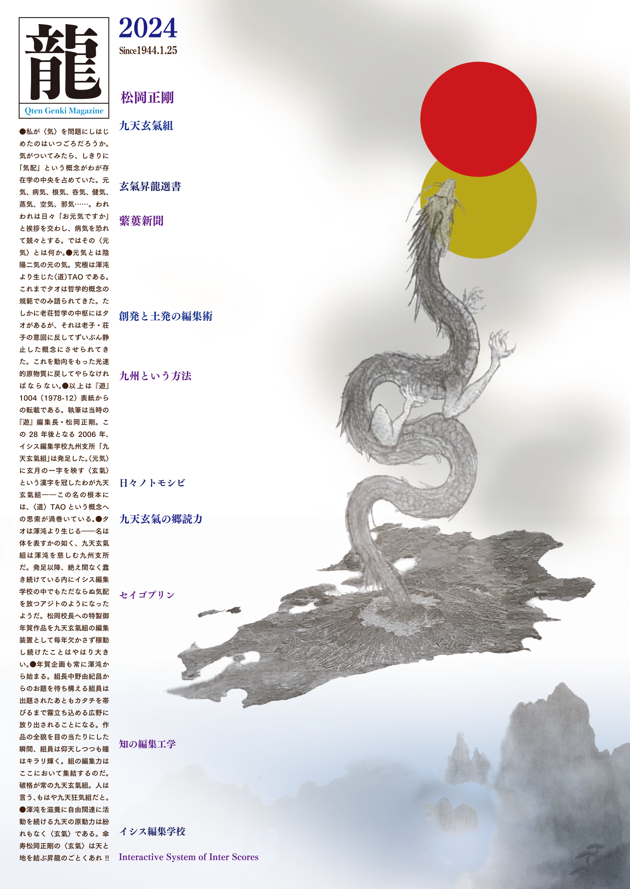 2024年の作品は、年始挨拶と松岡校長の傘寿祝いを掛け合わせたために、いつもに増してスペシャルだ。企画は2本立て。一つは「QtenGenkiMagazine2024『龍』傘寿号」、もう一つは和傘オブジェ「玄氣昇龍祝い傘」である。『龍』は『遊』(工作舎)に肖った2023年の『卯』言祝号に続くものだが、内容はぐんとアップグレード、積極的に“外気”を取り込んでいる。