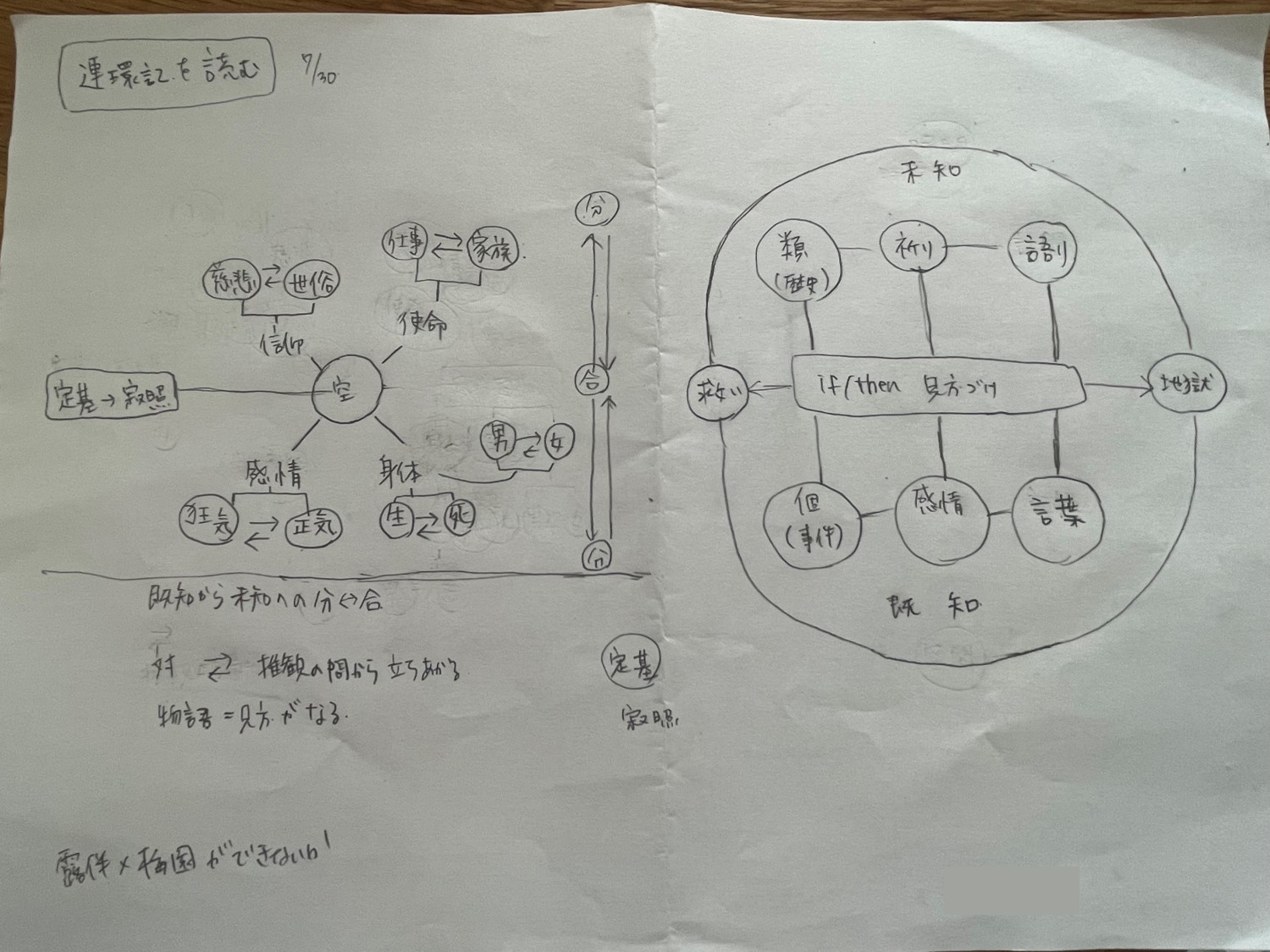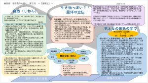 2番目の座衆Aの発表において、左側の図では『連環記』で対になって出てきたワード群に対して、それらのペアの間を露伴が繰り返して論じていた構造を描いたと説明する。前期の輪読座で取り上げた三浦梅園の方法である剖析(ぼうせき)と関係づけつつ、座衆Aは『連環記』の中の既知ワードを見据え、対となる未知ワードを見つけようとするカマエを持ちながら図像化に向かっていたのだ。