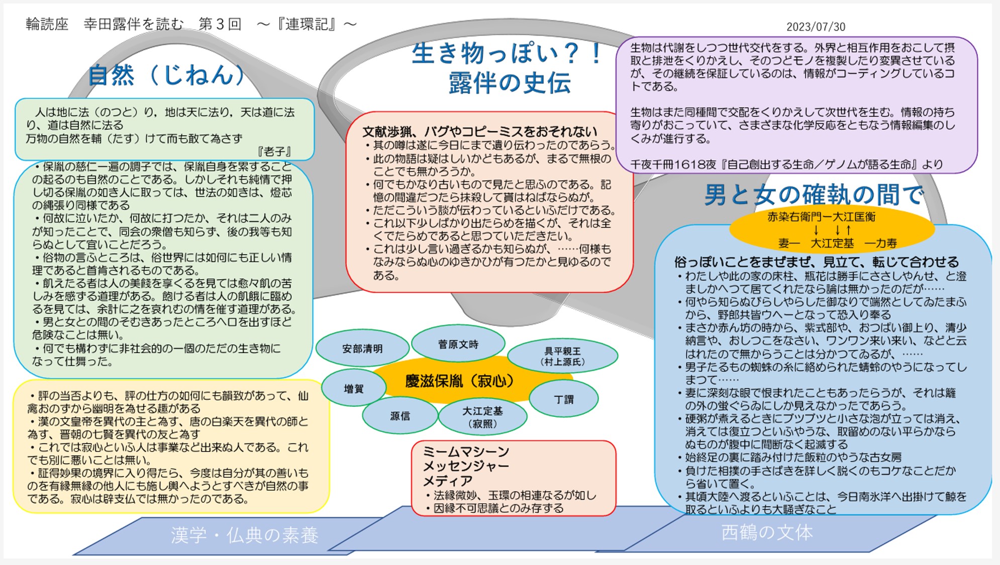 日本列島に猛暑の夏が到来している。世界気象機関は7月27日に観測史上、最も暑い月となる見通しを発表。地球上で12万年ぶりの暑さとなることを指摘する専門家もいる。過酷な気温に負けず、豪徳寺の編集工学研究所では明治から昭和初期の文人・幸田露伴(1867~1947)を読む講義が7月30日に開催された。いつも使っている編工研1Fの本楼のネットワーク環境が不調のため、13時の開始直前に2Fの学林局へ大急ぎで移動。前回の第三輪の最後に示された宿題(露伴の『連環記』を読んで図像化)の発表が第四輪冒頭で行われる。複数の参加者から宿題が提出された中で、受講生である座衆Мと座衆Aと、講師役である輪読師・高橋秀元の交し合いを今回レポートする。