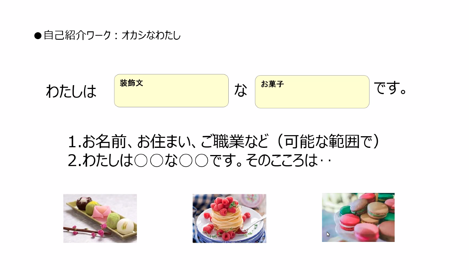 オンラインの会に集まった参加者は、米田ナビに促されて自己紹介を始めた。お題は「オカシなワタシ」。お菓子に喩えて、自分を表現してみようというものだ。