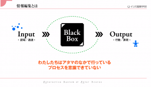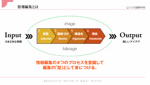 書籍や動画の編集、またはプログラムの編集といった答えを想定していた米田ナビは驚きを隠しきれない。「今日、集まってくださったみなさんはすごいですね!その通りです」と、喜ぶ。まさに、インプットとアウトプットの間の咀嚼が編集なのだ。米田ナビは、準備していたスライドを投影しながら確認する。