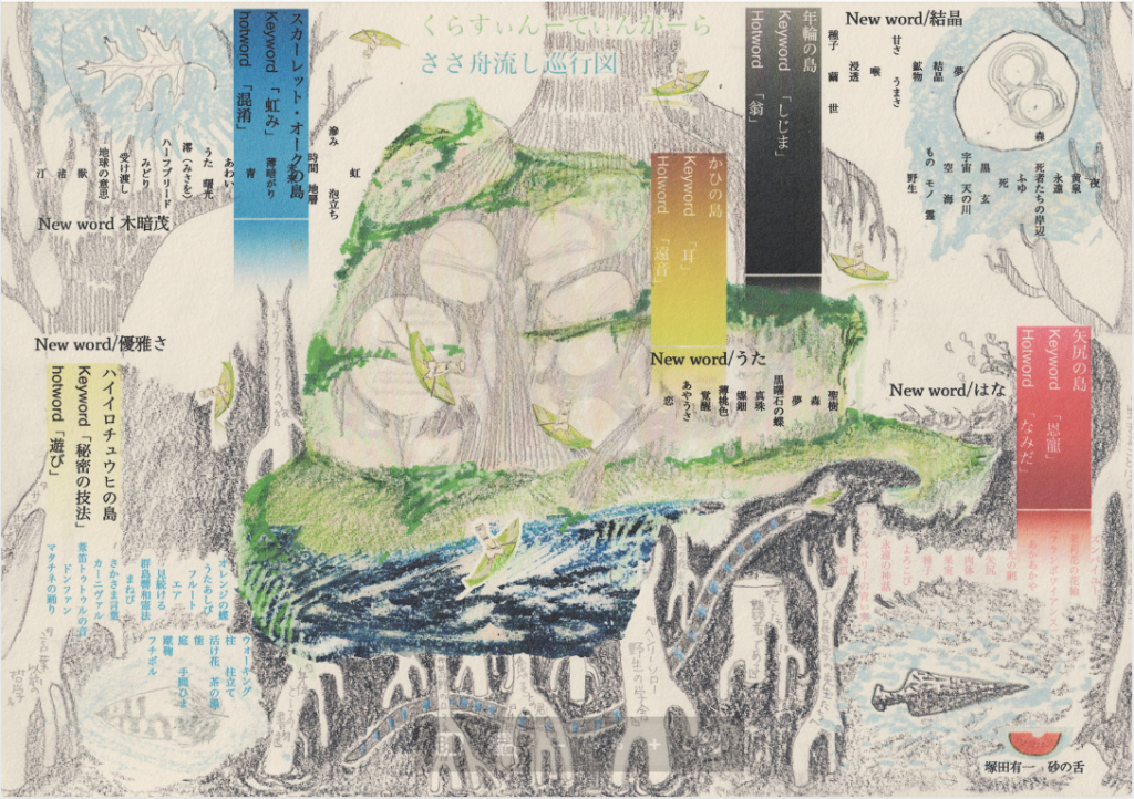 ▲西村さんの群島マップ。前日、「オープニングセッションはZOOM越しだったので、校長と今福さんの対談にワクワクしすぎて今日は眠れないかもです(w」とつぶやいていたが、受賞効果であと3カ月くらい眠れなくなるのではなかろうか。