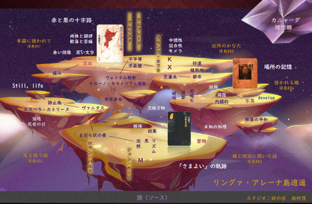 多読ジムスペシャル「今福龍太を読む」は本の群島を巡る6週間の航海だった。6月5日(土)のオープニング・セッションで、読衆たちは群島-読書地図「今福龍太の6つの島宇宙」を受け取った。地図に描かれた島々には「クレオール」「イマージュ」「書物」「ユートピア」「群島」「ホモ・ルーデンス」の6つのキーワードと、今福龍太さんの著書の情報が散りばめられている。その中から3冊を選び、『リングア・フランカへの旅』を船として、島から島への冒険に出かけた読衆たち。それぞれの島旅を元に、自らの「群島マップ」と「旅日記」の2種類のアウトプットをすることが今季の多読スペシャルの最終お題であった。
