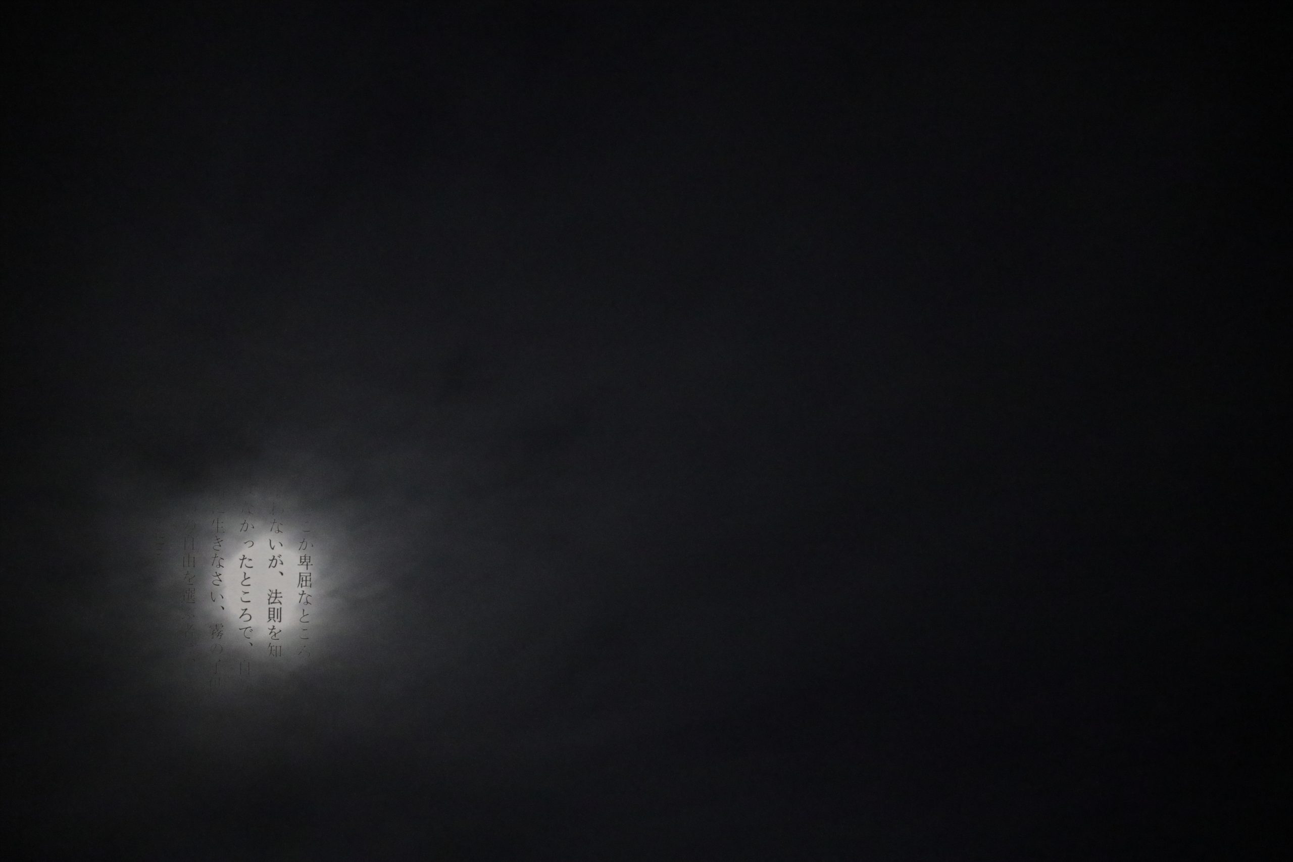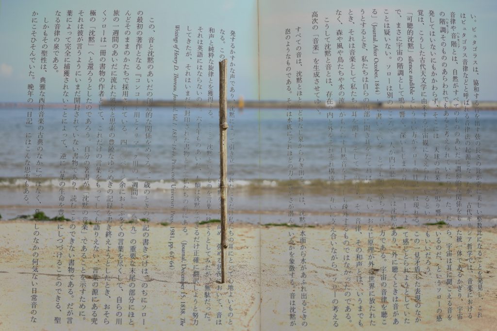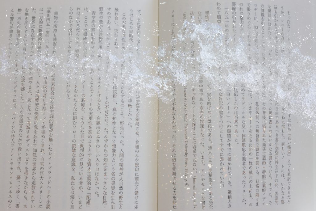 ▲白いノート、ハックルベリー、野生、より高次の法、レッカー、種子、書かれない書物、可聴的沈黙、極小の「社会」、死ぬ可能性、耕作、霧(=謎/未知)と名付けられた12の写真からなる作品を創り上げた木藤さん。上の写真は「白いノート」「可聴的沈黙」「霧(=謎/未知)」の3枚。「霧(=謎/未知)」について今福さんは次のような言葉を贈った。「霧のなかで本のページがほとんど見えない、ほんの一部だけ痕跡が見えている。こういう世界がいま非常に大事だと思っています。モノというのがあまりに可視化され、データ化され、晒されているなかで、霧は露呈させる権力から守る、とても重要な抵抗のメディアになっていくでしょう」