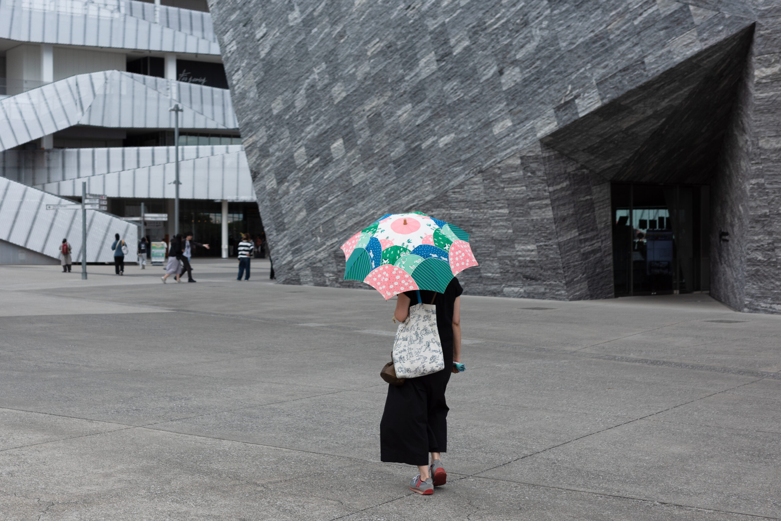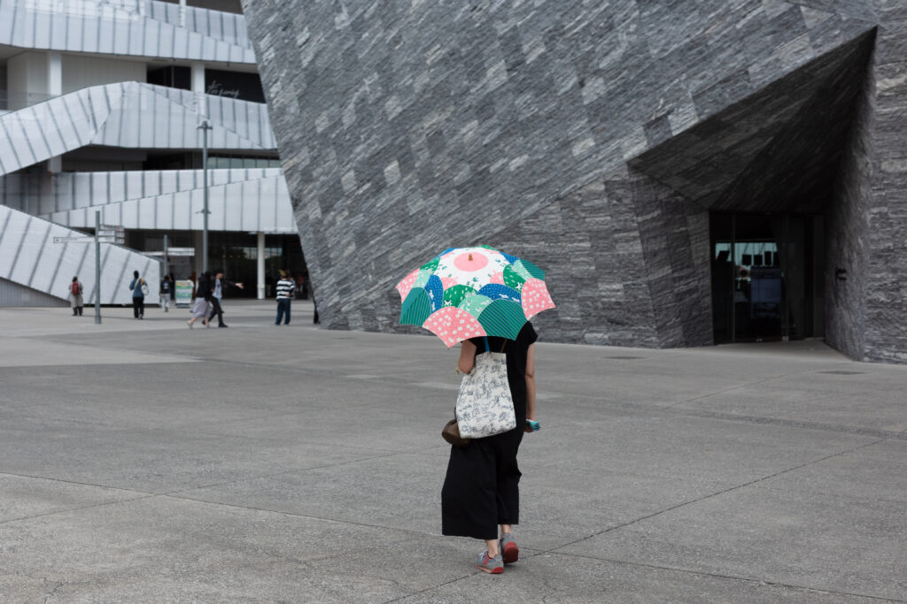 朝9時台のミュージアム開館前。カラフルな傘で、黒山の登山口に着く田中志穂師範代。学衆との対面はこのあとすぐ
