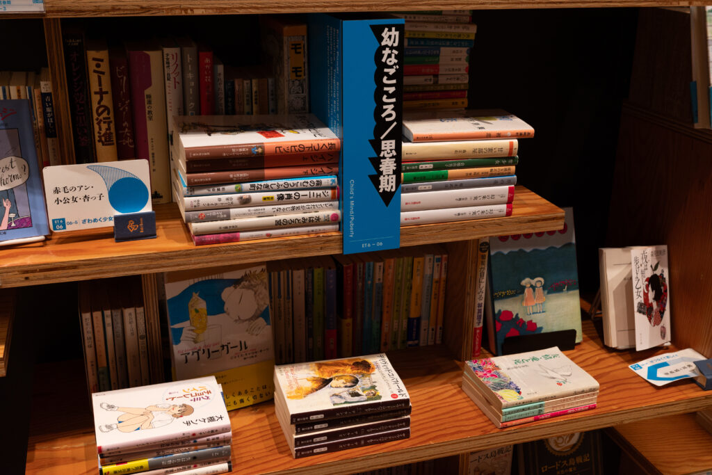「幼なごころ/思春期」の本棚。「赤毛のアン・小公女・杏っ子」の三位一体型のポップや、『グミ・チョコレート・パイン』、『コパーフィールド』、『友情』の三位一体型の平置きが、若き日の苦悩や夢、絶望や勇気の記憶を蘇らせる