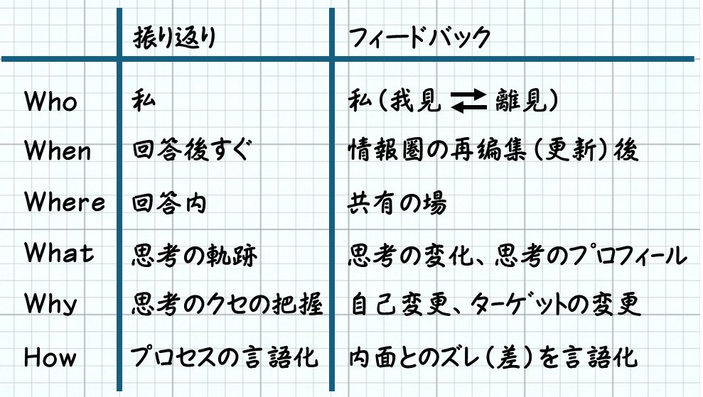 では、振り返りとフィードバックの違いは何か。こういうときは、5W1Hに置き直してみるとよい。