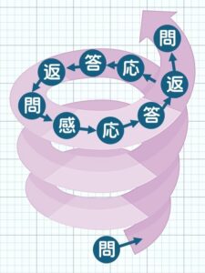 ▲「問・感・応・答・返」もまた、問→感→応→答→返→問→感→応→答→返→問……と螺旋を描くように動き続けている。「問」から「感」への道筋は、複数であり、ノンリニアである。