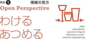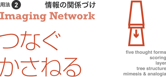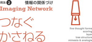 [守]コースは「用法一」の、視野を広げて多様な情報を集め、自在に分けていく「わける・あつめる」お題からスタート。次なる「用法二」では情報と情報を「つなぐ・かさねる」ことで情報の理解や記憶を進め、ダイナミックに発想を生む「型」を学ぶ。