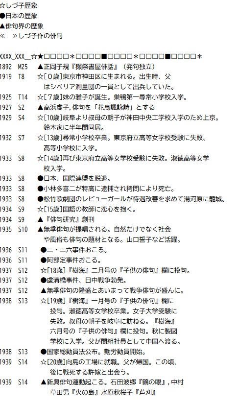 何はともあれまずは読まねばならぬ。私は深く読むため、お題と並行してしづ子の生い立ちと当時の時代状況をコンパイルし、「しづ子史」「戦前・戦中・戦後の日本史」「昭和の俳壇史」という3つの年表をミックスしたクロニクルを作った。お国に仕える勤労少女だったしづ子が占領軍の兵士と恋仲になる様子と、戦後日本の姿が重なる。敗戦とは、欧米列強に追いつくべく「一人前の男」としての近代国家を目指した日本が「アメリカの“女”」になっていく経験ではないか――そんなワールドモデルがむくむく立ち上がる。