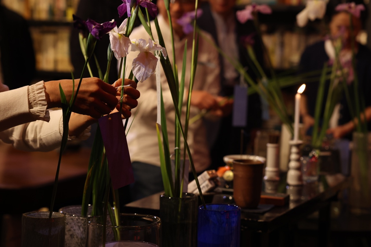 第1部、塚田有一堂守による花活けのデモンストレーションは、檜、車輪梅の静かでダイナミックな始まりから、花菖蒲の凛と優美なたたずまいへ。息も忘れて見入りつつ、参加者の感じた思いの一端をご紹介。