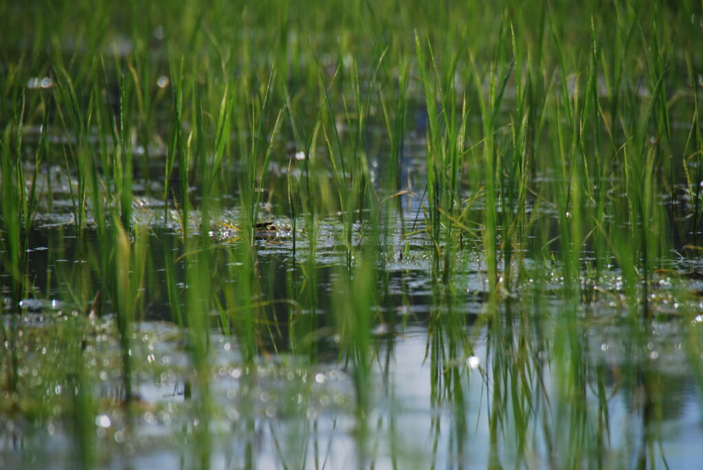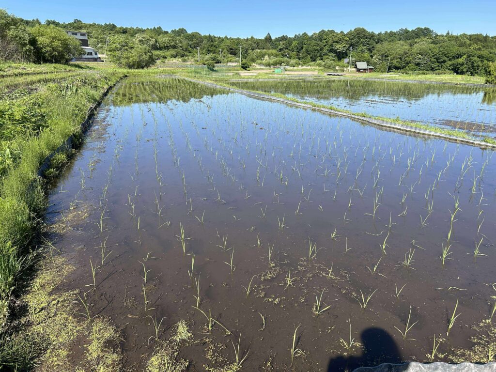 今年の田植えは5月31日だった。植えた直後の田んぼはご覧の通り。まだ苗は小さく、収穫を迎える10月まで無事に育ってくれるか、ファーマーたちの胸は期待と不安でいっぱいだ。無農薬なのでここからは草との闘いになる。
