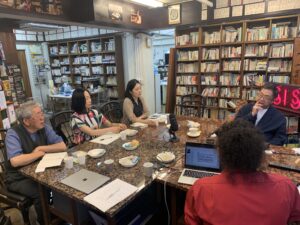 休憩時間に武邑慧匠とのおしゃべりが弾む学林堂。